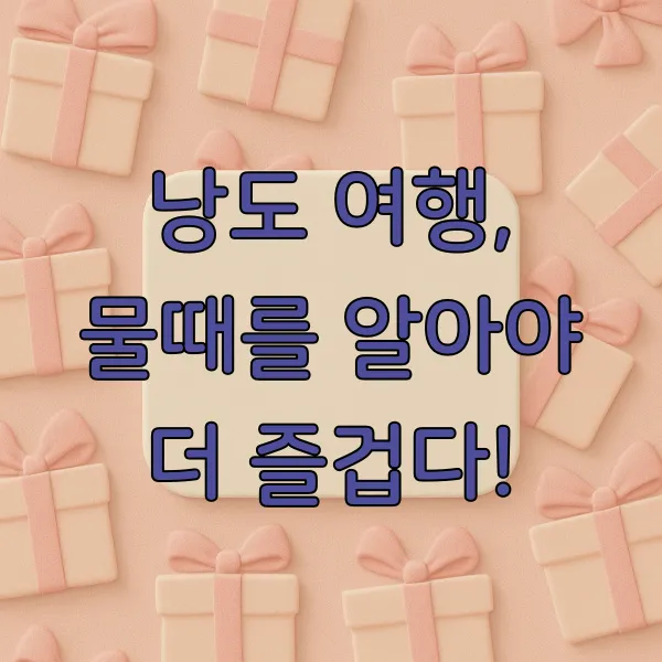 물때는 바닷물의 높낮이가 변하는 시기를 말하는데요, 낭도처럼 해안 지형이 발달한 섬에서는 물때에 따라 즐길 수 있는 활동이 달라진답니다. 간조 때는 갯벌이 드러나 조개나 게를 잡을 수 있고, 만조 때는 바닷물이 차올라 시원한 해수욕을 즐길 수 있어요. 특히 낭도 해안가에 있는 공룡 발자국은 간조 때만 볼 수 있으니, 꼭 간조 시간을 확인하고 가셔야 해요!