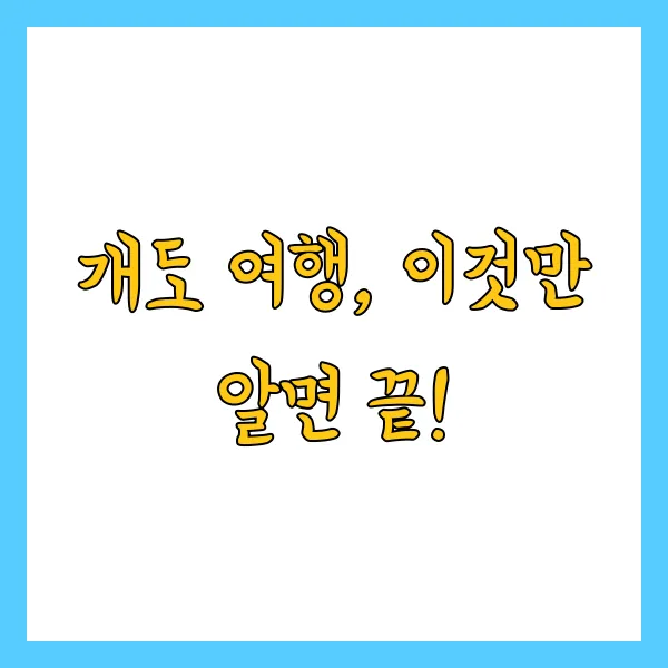 개도 여행을 더욱 알차게 즐기기 위한 팁을 몇 가지 알려드릴게요. 첫째, 편안한 신발을 준비하세요. 둘째, 자외선 차단제를 꼼꼼히 바르세요. 셋째, 섬 특산물을 맛보세요.