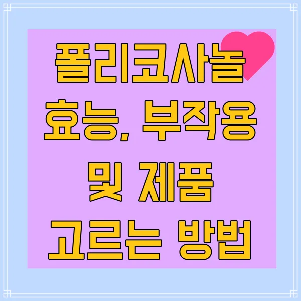 콜레스테롤 관리, 이제 폴리코사놀로 시작해 보는 건 어떠세요? 🤔 나쁜 콜레스테롤(LDL)은 낮추고 좋은 콜레스테롤(HDL)은 높여 심혈관 건강에 도움을 줄 수 있다는 놀라운 폴리코사놀 효능! 🤩 하지만 부작용과 제품 선택 기준은 필수 체크! 💯 쿠바산 사탕수수, 순도, 함량 등 꼼꼼히 따져보고 나에게 딱 맞는 폴리코사놀 제품을 선택해 건강 관리 시작하세요! 💖 혈압 조절, 항산화 효과까지 챙겨 더 건강한 삶을 만들어보자고요! 🥰